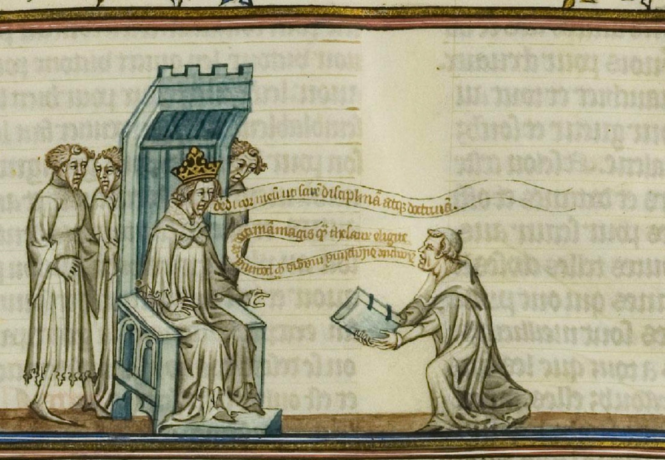 Nicole Oresme oferece sua tradução de Aristóteles ao Rei Charles V da França (Reprodução: Musée Condé)