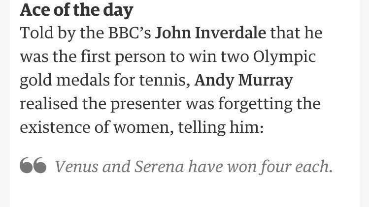 Murray foi o primeiro a ganhar duas medalhas de ouro nas partidas individuais. Não foi a primeira pessoa a conseguir isso na modalidade: Venus e Serena conquistaram o ouro em duplas em 2000, 2008 e 2012. Venus ganhou o ouro em individuais em 2000 e Serena em 2012. Além disso, Mary Joe Fernández e Beatriz Fernández ganharam o ouro em duplas em 1992 e 1996. Felizmente que Murray estava lá para lembrar a este "profissional da informação" que as mulheres também existem e que também são pessoas - e para mostrar que ser bicampeão e ser humilde não são coisas que se excluem.  As conquistas femininas são constantemente passadas por alto: os livros de História dizem que foram os homens que fizeram o mundo enquanto nós ficámos sentadas a ver: aceitamos passivamente que as crianças aprendam isto. Quantas cientistas ou pintoras as pessoas em geral são capazes de nomear? Ou quantas sabem que temos Wi-fi ou ressonâncias magnéticas graças a mulheres? Não é uma questão de ver quem é melhor: é uma questão de justiça - e que envolve todos.