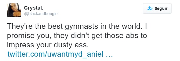 Eu disse que não ia falar aqui dos Jogos Olímpicos, mas há algo que não deve passar despercebido: o sexismo constante durante a competição, quer em comentários nas redes, em notícias...Um lamaçal sem fim e muita gente acha normal. Nem sequer digno de nota. Num evento de celebração do desporto percebemos como o mundo é tão hostil para as mulheres: Mulher de y ganha medalha de bronze, Michael Phelps partilha noite histórica com afro-americana, Muito bem marido - foi assim que um jornal anunciou o ouro nos 400 metros em natação de Katinka Hosszú, atribuindo a vitória ao seu treinador e marido. They’re less interested in the result and more interested in the journey, disse alguém num canal de TV. E quando se atinge um nível de total nonsense: três ginastas americanas (incluindo Simone Biles que ganhou cinco medalhas) sofreram bullying na net por causa dos seus músculos: vocês acham isso atraente? Uma resposta tornou-se viral com mais de 50 mil retweets: