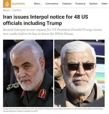 O Irão solicitou à Interpol a emissão de um alerta vermelho internacional destinado a prender Trump e outras 47 autoridades norte-americanas identificadas como responsáveis pelo assassinato, em Janeiro do ano passado, do major-general Qasem Soleimani, comandante do Exército dos Guardiães da Revolução Islâmica.