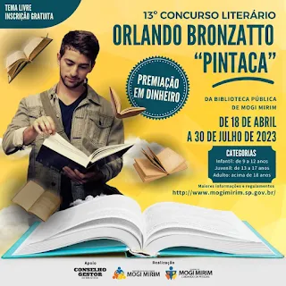 Estão abertas até o dia 30 de julho de 2023 as inscrições para o 13º CONCURSO LITERÁRIO ORLANDO BRONZATTO "PINTACA" DA BIBLIOTECA PÚBLICA MUNICIPAL DE MOGI MIRIM. O concurso tem a finalidade de promover a criatividade, incentivar o hábito da leitura e da escrita, além de descobrir novos talentos literários.