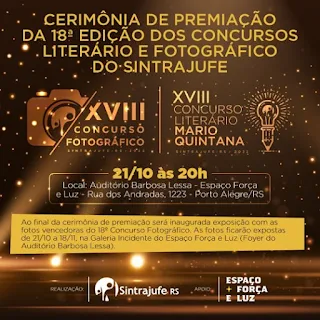 O Sintrajfe divulgou o resultado dos seus concurso culturais em 2022. A lista dos vencedores segue abaixo. Os nomes dos escritores e fotógrafos está em ordem alfabética, pois o resultado final dos concursos será conhecido apenas no dia da cerimonia de premiação. O evento será no dia 21/10/2022 de forma presencial após dois anos às 20h, no Auditório Barbosa Lessa do Espaço Força e Luz (Rua dos Andradas, 1223).