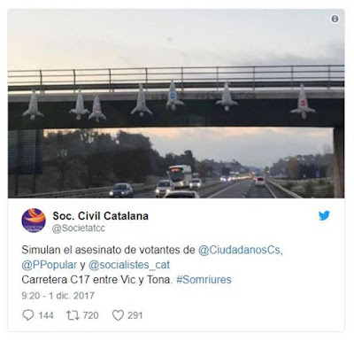 A imagem é do Twitter, foi obtida hoje às 06:30, e vem estampada nas edições online de muitos jornais. Numa via rápida à entrada de Barcelona foram pendurados 'corpos' identificados com os símbolos dos partidos constitucionalistas, ou seja, anti-independência catalã. Sem comentários.