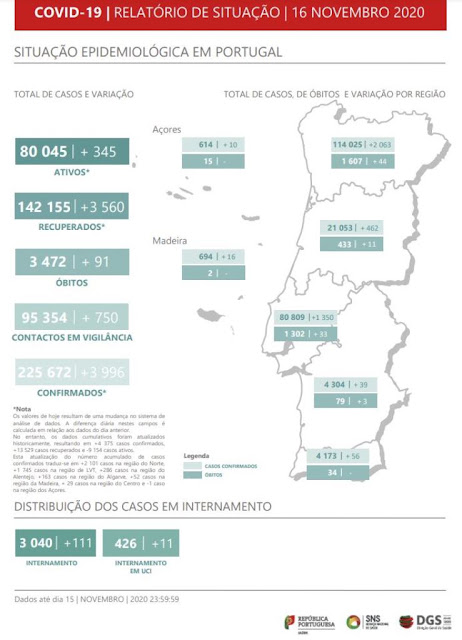 Situação Covid-19 em Portugal, hoje. Mais 3.996 infectados e 91 mortos.