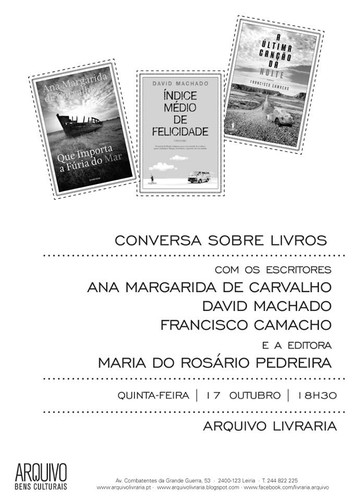Já aqui elogiei – mas nunca será demais fazê-lo – a Livraria Arquivo, em Leiria, e o profissionalismo e simpatia dos que ali trabalham há muitos anos (mais do que todos, Paula Carvalho), tornando as nossas visitas leves (porque, quando é para lá, a viagem nem custa), divertidas (porque o público é muito bem-disposto e nos faz sentir em família) e produtivas (porque se fala sempre de questões interessantes e não há nada melhor do que trocar ideias). Pois hoje esfrego de novo as mãos, já que amanhã volto lá, agora com a companhia de três dos meus autores: Ana Margarida de Carvalho, que se estreou em 2013 com o romance Que Importa a Fúria do Mar; Francisco Camacho, que depois de Niassa (vencedor do PEN para Primeira Obra em 2008) nos trouxe em Maio A Última Canção da Noite; e, por fim, David Machado, que escreveu Índice Médio de Felicidade, publicado há cerca de um mês. Este último escritor é o único dos três que já foi à Arquivo por ocasião da publicação de Deixem Falar as Pedras, mas estou mais do que certa de que os outros dois adorarão a sessão e também vão querer ser repetentes. Eu cá estou mortinha por lá chegar e rever os amigos.