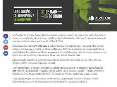 No passado 23 de Abril, Dia Mundial do Livro, revelei ser eu, este ano, o autor homenageado em Alvalade Capital da Leitura. Hoje acrescento os nomes de quem participará nos vários momentos do ciclo literário, que tem curadoria de Carlos Vaz Marques.