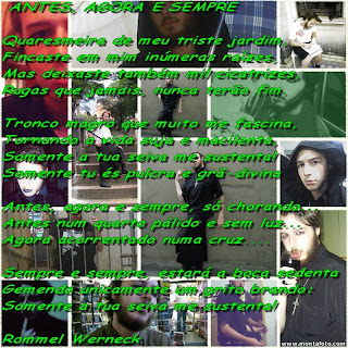 ACREDITO QUE HOUVE ALGO QUE O INFLUENCIOU A ESCREVER TAMBEM O GÓTICO, CERTO? QUEM SERIA?Rommel: Na minha primeira fase poética ( 2002-2005), eu já escrevia sonetos meio góticos embora não tivesse consciência de que eram góticos e nem eram tão trevosos assim, mas exprimiam esse lado passadista muito comum nos meus poemas. Após o curso de Moda ( julho de 2006), resolvi mudar radicalmente minha vida e pôr tudo para fora, nessa época emagreci muito!!!! Durante todo o curso, ia a pé para a Vila Prudente e isso ajudou e no período pós-curso também caminhava bastante. Um psicólogo me falou que não parecia um rapaz de 18 anos e sim um velho pela minha visão de minha. Resolvi me revestir de estilo gótico para recuperar a adolescência perdida, mas de modo poético. Aí, está a minha poesia, num contexto antigo, bem velho.... E quando retomei a poesia em 2007 foi para o estilo gótico que rumei também, o primeiro soneto após meu bloqueio foi o Soneto, é o texto mais leve que fiz e um dos que mais gosto, ( Os braços azuis...)
