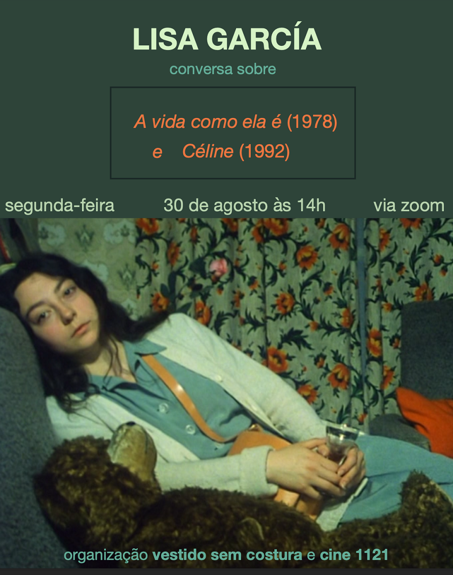 Segunda (30/08), às 14h, iremos conversar com Lisa García sobre os filmes A vida como ela é (1978) e Céline (1992), dirigidos por Jean-Claude Brisseau. O encontro contará com tradução consecutiva e acontecerá via Zoom. Para participar, basta se inscrever no formulário: Conversa com Lisa García (google.com)