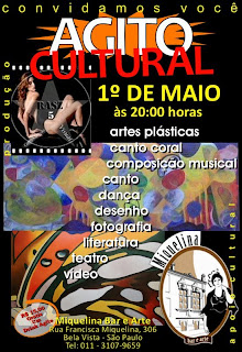 A produtora cultural Regina Z (RASZ5) realizará no Miquelina bar & Arte uma noite de Agito Cultural que pretende marcar São Paulo. Eu me apresentarei neste evento com uma performance cênica de poesias retrôs divulgando nosso blog. Aguardo os nossos escritiores e seguidores de São Paulo lá.