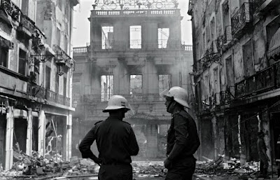 Nesse dia fui acordado muito cedo pelo Jorge — O Chiado está a arder. [...] O espectáculo dos Armazéns do Chiado a ruir era indescritível. Aconteceu o mesmo ao Grandella, mas dali não se via. A discoteca Valentim de Carvalho e a Ferrari ficaram reduzidas a carvão. O Martins & Costa, a melhor loja gourmet da cidade, desapareceu do mapa. Havia gente a chorar. [...] Voltei para o ministério com um nó na garganta. À noite, as imagens da RTP estavam longe de transmitir o horror. Durante anos, as pessoas subiam e desciam o Chiado em passadiços de ferro que foram montados na Rua do Carmo e na Rua Garrett. À hora do rush, essas plataformas oscilavam com o peso da multidão. Nos dias de chuva, o Chiado reproduzia o cenário fantasmático de Blade Runner. A reconstrução levou dez anos. Nesse intervalo, uma das poucas razões para voltar ao Chiado era o teatrinho que Mário Viegas dinamizou num anexo do Teatro São Luiz. Nuno Krus Abecasis, o presidente da câmara, convidou Siza Vieira a pôr de pé o novo Chiado, mantendo o desenho das fachadas originais. [...] — Eduardo Pitta, Um Rapaz a Arder, Lisboa: Quetzal, 2013.