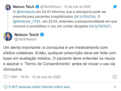 Imagem: tuítes de Nelson Teich do passado dia 12. Clique.