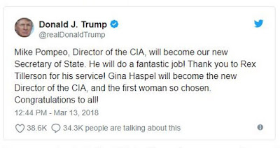Trump anunciou há pouco, no Twitter, a substituição de Rex Tillerson por Mike Pompeo. O director da CIA vai ocupar o lugar de Secretary of State (ministro dos Negócios Estrangeiros), o mais importante da administração americana, num momento particularmente crítico da política internacional. Eu e Pompeo estamos sempre na mesma onda, disse o Presidente, para justificar a súbita escolha. Entretanto, Gina Haspel substituirá Pompeo à frente da CIA. Tillerson, 66 anos, amigo pessoal de Putin, é um influente homem de negócios, identificado com a ala moderada dos Republicanos, Chairman e CEO da ExxonMobil até entrar para a Casa Branca. Pompeo, 54 anos, é um falcão do Tea Party. Está tudo dito.
