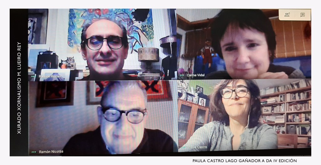 Celebrei no día de onte unha reunión telemática con Carme Vidal, Ramón Rozas e Carmen Carreiro, alma máter do concurso que conta coa colaboración do Concello de Fornelos, para dirimir unha nova edición do premio de Xornalismo Manuel Lueiro Rey. Por unanimidade o galardón recaeu no artigo “Mulleres invisibles, mulleres desconfinadas” da autoría de Paula Castro. Reproduzo abaixo a valoración do xurado e ao mesmo tempo o artigo da gañadora. Os meus -nosos- parabéns por esta peza xornalística tan acaída ao espírito do galardón e benvida, Paula, á causa Lueiro.