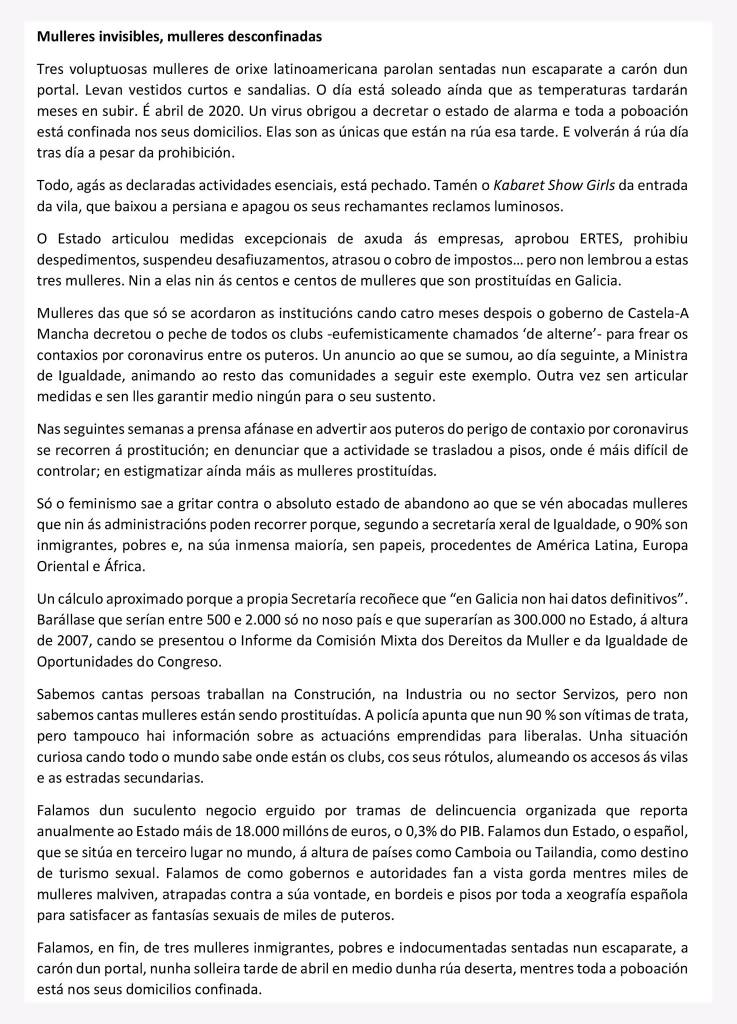 O xurado salienta a solidez dun artigo que cumpre os requisitos do galardón Lueiro Rey, isto é, Paula Castro ofrece un texto que se acaroa á temática de preocupación cívica e denuncia social ao ofrecer unha reflexión sobre a estigmatización á que están sometidas as mulleres que viven de exercer a prostitución. A autora articula, asemade, unha visión crítica e documentada sobre este negocio de explotación sexual e repara sobre o abandono que sofren estas mulleres sen dereitos, poñéndolle un rostro a persoas abocadas á invisibilidade, ao desprezo social e a unha heroica subsistencia.