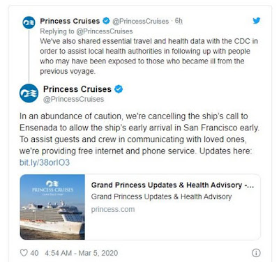 — Mais um navio de cruzeiros em quarentena. Desta vez é o Grand Princess (com três mil passageiros e mil tripulantes a bordo), ao largo de São Francisco. Um passageiro já morreu.