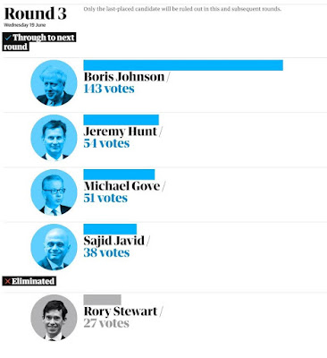 Resultado final: Boris Johnson 143 /Jeremy Hunt 54 / Michael Gove 51 / Sajid Javid 38 / Rory Stewart 27.