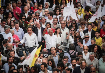Clique na imagem: Costa a descer o Chiado, anteontem, vendo-se (entre outros), da esquerda para a direita, Mário Centeno, Fernando Medina, Carlos César, Ferro Rodrigues, Jamila Madeira e o primeiro-ministro António Costa.