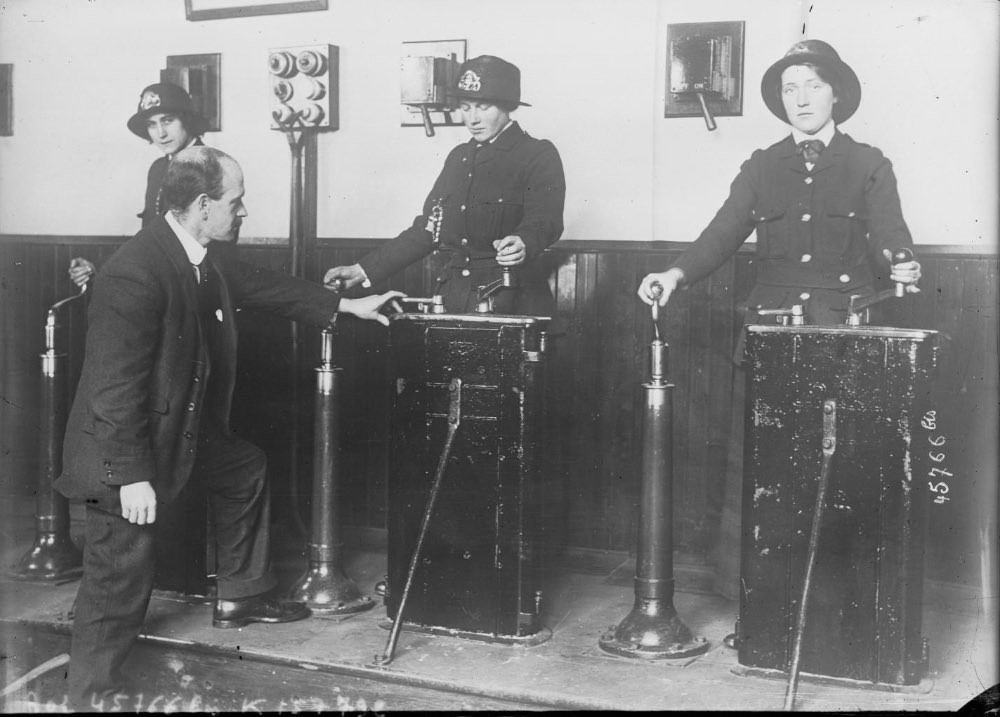 (Mulheres aprendem a conduzir comboios usando um simulador, Inglaterra. 1915)