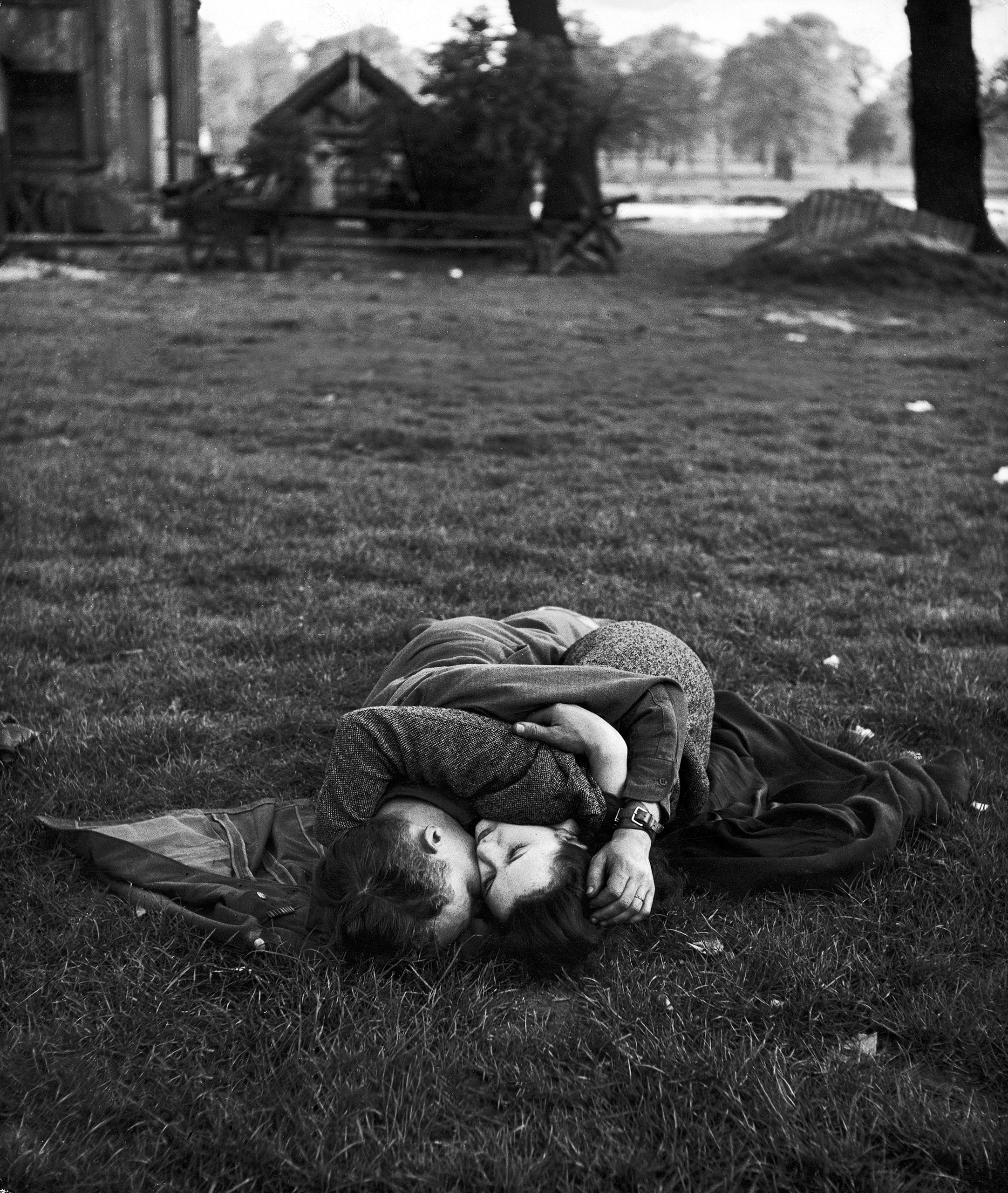 (Soldado americano beija a sua namorada inglesa na relva do Hyde Park - um dos lugares favoritos das tropas americanas estacionadas em Inglaterra. Foto de Ralph Morse para a revista Life. Maio de 1944)