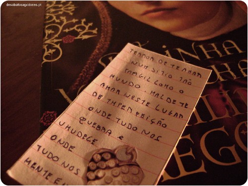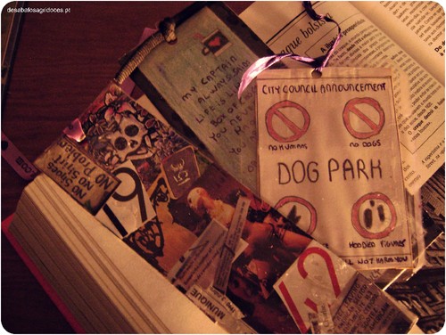Para estes tirei a ideia daqui. Tive que fazer umas adaptações pois não tenho tinta na impressora nem papel de plastificar, além de que nem sei fazer isso: recortei imagens de umas revistas velhas (umas Volta ao Mundo de 2005 que não sei como vieram parar cá a casa), colei aleatoriamente em cartolina e depois colei entre duas folhas de acetato. Tive alguns problemas com a cola, uma coisa líquida e nojenta que acabava sempre mais nas minhas calças e cabelo do que no papel, mas enfim...Para os outros usei o mesmo processo, mas desenhei em vez de recortar. Quando andava á procura de material (não comprei nada tirando o raio da cola), encontrei um diário velho daqueles de miúda e fiz marcadores como o que está na segunda foto. Recortei o papel á medida, colei em cartolina e decorei com frases e pequenas imagens.