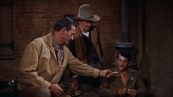Já muita tinta correu sobre a cena de abertura sem diálogos e a forma como as relações entre as personagens com as suas caracterizações singulares ficam delineadas, resultando um momento primorosamente exemplar de uma história a ser contada visualmente pela interpretação física dos atores (expressões faciais, posturas de corpos, pequenos movimentos e depurados gestos), pela montagem e pela colocação da câmera. Basta-nos a inquietação das mãos de Dude a acariciarem desesperadamente o queixo, o seu andar titubeante com o qual atravessa o saloon e o brilho dos olhos com que contempla um copo estendido para sabermos do alcoolismo que o corrói espiritualmente. Tal como basta o incompassivo atirar da esmola — pelo cowboy que lhe estende o dito copo — rumo ao interior de uma escarradeira para sabermos quem é, de imediato, o vilão. E depois, claro, à medida que Dude se debruça para o recipiente imundo, surge um pontapé salvador, um corte abrupto para um contra-picado, o princípio hawksiano da “câmara à altura dos homens” a ser desfeito para mostrar o olhar reprovador de Chance. É o primeiro sinal que temos dessa amizade, a forma como fica estabelecido com um pontapé e um olhar que Chance nunca permitirá o degradamento e humilhação de Dude pela colocação da mão no vaso surrento. Não há outra coisa que aquele contra-picado diga a não ser isto: Chance é, para Dude, um colosso, é ele que o ajudará a erguer-se da sua gradual decadência e a fazer do adjunto o profissional dedicado de outrora.