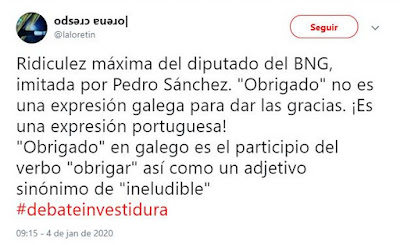 Mas o erro não foi exclusivo de Sánchez. O deputado galego Néstor Rego, do BNG, também terminou o seu discurso com um obrigado. Não admira, porque tudo indica que Rego milita no movimento reintegracionista, adepto da união cultural, linguística e social da Galiza e de Portugal.