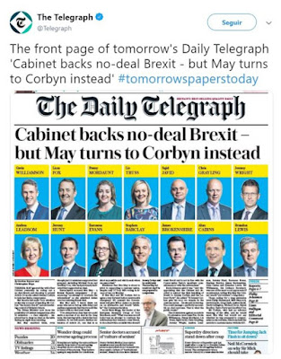 Na imagem, a capa do Daily Telegraph de hoje, com os retratos dos 14 ministros que querem sair já e sem acordo. Clique.