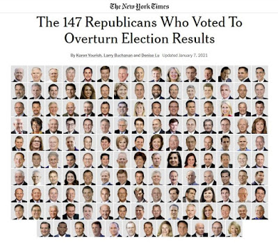 Para que os eleitores não esqueçam, aqui estão os retratos dos oito senadores e dos 139 congressistas republicanos que pretendiam reverter a decisão do Colégio Eleitoral, sustentando até ao fim (mesmo durante e após a invasão do Capitólio) a alegação de fraude eleitoral.