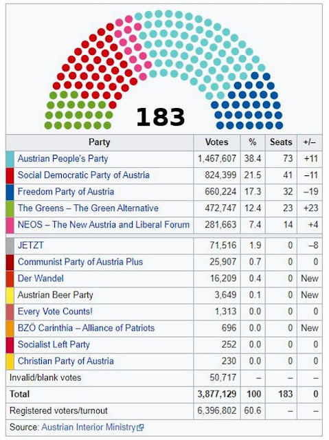 Obtendo 38,4% dos votos expressos e elegendo 73 deputados, o Österreichische Volkspartei, ou Partido do Povo (centro-direita), de Sebastian Kurz, venceu as eleições.