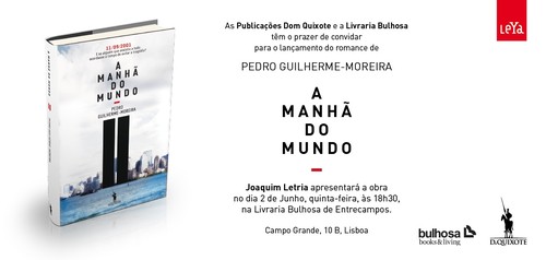 Logo mais, fazemos a apresentação pública do romance A Manhã do Mundo, de Pedro Guilherme-Moreira, na Livraria Bulhosa de Entrecampos. Não é o seu primeiro romance, mas é o seu primeiro romance publicado e é, sobretudo, o «meu» primeiro romance deste autor que fui conhecendo melhor ao longo do tempo e corre agora o risco de ficar meu amigo. Mas, para quem lê este blogue, o importante é dizer que A Manhã do Mundo é um livro que deve ser lido sem reservas, pois, além de ser um dos melhores que publico este ano, torna-nos, afinal, melhores pessoas. No ano em que se celebra o décimo aniversário do ataque às Torres Gémeas, este romance que me orgulho de publicar é uma das mais bonitas homenagens a todos os que ali perderam a vida.