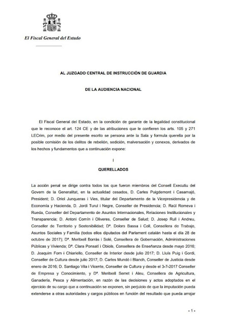 Num acórdão de 118 páginas, José Manuel Maza, procurador-geral do Ministério Público de Espanha, acusa Puigdemont, Carme Forcadell e os membros da Mesa do Parlament, Junqueras e os consellers do Govern catalão, dos crimes de rebelião, sedição, desvio de fundos públicos e delitos conexos. Para evitarem a prisão, cada um dos 20 arguidos terá de pagar 300 mil euros de fiança.