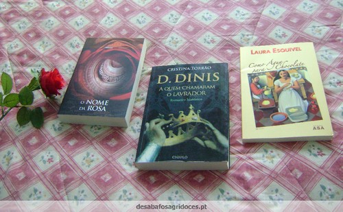 Este mês o único livro que comprei fui o Nome da Rosa de Umberto Eco. Já andava há imenso tempo para o comprar, mas todas as edições que encontrava custavam para lá dos 20 euros. Quando vi esta edição da revista Sábado no Déjá Lu por 6 euros decidi aproveitar. D. Dinis, A Quem Chamaram o Lavrador de Cristina Torrão ganhei no blog Dos Meus Livros. E veio com dedicatória da autora....adorei! Como Água para Chocolate ganhei no blog Ler é Viver. Por acaso li o livro há coisa de uns dois anos, mas não tinha nenhum exemplar meu. Para o ano há mais, assim esperemos.