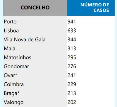 A situação, hoje. Os mapas são da DGS, enumerando o de baixo os dez concelhos mais afectados.