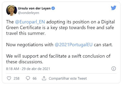 Imagem: tuíte da presidente da Comissão Europeia a saudar a aprovação. Clique.