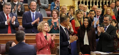 Na imagem do twitter de Sánchez podem ver-se, da esquerda para a direita, Batet e Llop no momento em que são aplaudidas. Clique.