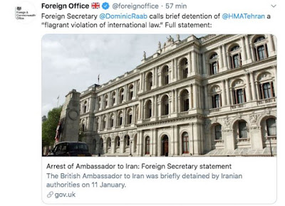 O diplomata estaria a fotografar a vigília, facto que terá levado os Guardas Revolucionários a intervir. Em consequência, Dominic Raab, ministro britânico dos Negócios Estrangeiros, declarou que o Irão está a um passo de transformar-se num Estado pária.