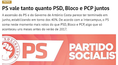 Foram hoje divulgadas duas sondagens, uma da Intercampus, no Correio da Manhã e no Negócios, outra da Aximage, no Económico. Ambas colocam o Partido Socialista no limiar da maioria absoluta.