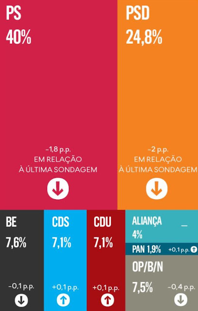 O PSD obtém o pior resultado de sempre. CDU e CDS empatados. O partido de Santana Lopes, sondado pela primeira vez, obtém 4%.