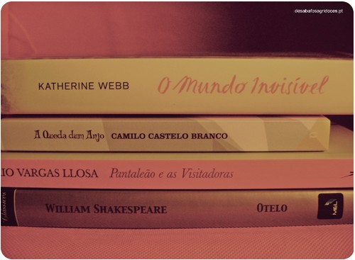 Uma coisa que me acontece muitas vezes é começar um livro, chegar a meio, perder o interesse e começar outro. O resultado é que as leituras vão-se acumulando...Mas é um sistema com que me dou bem até. Estes são os livros que tenho neste momento na mesa de cabeceira. No sentido metafórico, que a mesa é pequena e está sempre cheia de outras tralhas. O Otelo está em stand by desde o mês passado, não por causa da prosa que é excelente mas por causa do tema...Bah! Pantaleão e as Visitadoras comecei algures este mês e estou a gostar não só por causa da escrita do autor a que é sempre um prazer regressar mas porque a história é absolutamente hilariante: a organização de um serviço de prostitutas para as unidades do exército peruano estacionadas na Amazónia, com o objectivo de conter a onda de violações que assola as vilas próximas. Pantaleão é a personagem principal a quem missão é entregue..Um tipo que não obstante a sua adorável falta de conhecimento do assunto, consegue transformar as visitadores no serviço mais organizado do exército com hino próprio e tudo. Hilário e épico.