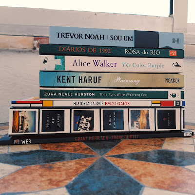Fiz anos e tive direito a umas coisinhas: de mim para mim, o há mais de dez anos desejado House of Leaves, de Mark Z Danielewski; do agregado familiar, We3, de Grant Morrison e a boxset de manga do The Legend of Zelda, de Akira Himekawa; e de amigas, a adorável História da Arte em 21 Gatos, de Nia Gould, o também muito desejado Sou um Crime, de Trevor Noah, e o Cânone, recentemente editado pela Tinta-da-China. Também deram entrada Diários de 1992, de Rosa do Rio (oferta da autora) e Plainsong, de Haruf Kent. Este último foi uma enorme supresa: veio na caixa surpresa (versão língua inglesa) da livraria Indie Not a Bookshop e a minha primeira impressão foi "nunca ouvi falar"; no entanto, quando fui adicionar ao Goodreads, vi que tinha em wishlist desde 2015...
