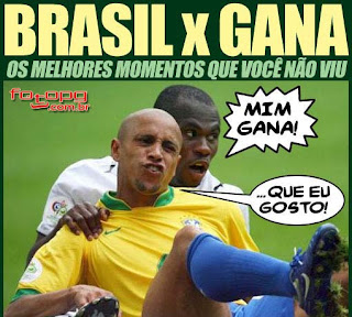 Brasil x Gana! Pense num jogo complicado. Já vi seleções olímpicas do Brasil perderem feio para Nigéria, para Camarões. Os times africanos têm tudo que nós temos de bom: a ginga, o drible, a agilidade, a flexibilidade, o improviso, o senso lúdico, a intimidade com a bola resultante de ter jogado com bola de meia, de plástico, de papel, de palha, de pano. Individualmente, os jogadores são espertos, quase todos jogam em times europeus. O que lhes falta é estrutura, tecnologia de treinamento, formação técnica e tática desde a base. O problema das seleções africanas não é dentro de campo, é fora; os times são bons, mas as estruturas... Dá pra tirar pelas nossas, pelas dos clubes profissionais do Brasil inteiro, que em geral são um horror.