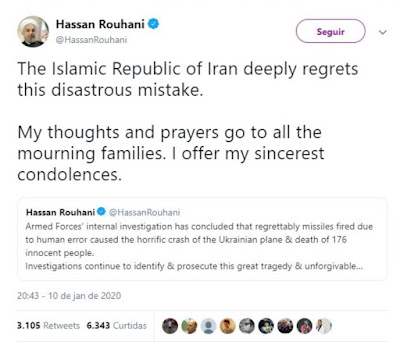 Hassan Rouhani, Presidente do Irão, assumiu publicamente o abate do vôo 752 da Ukraine International Airlines: «Disastrous mistake.»