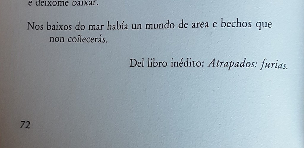 O dato curioso reside na referencia explícita que Xela Arias fai a ese gurpo de seis poemas como tirados do libro inédito Atrapados: furias. Evidentemente un dos títulos que manexou para o que sería Tigres coma cabalos.