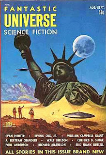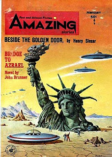 Qualquer sujeito que usasse hoje uma imagem tão famosa seria imediatamente acusado de plágio. Mas tenho aqui sobre a minha mesa o exemplar de fevereiro de 1964 da revista Amazing Stories, cuja capa, desenhada por Alex Schomburg, mostra (quatro anos antes do filme) a mesmíssima imagem, só que as ruínas da estátua são contempladas por astronautas que acabaram de descer de um disco voador.