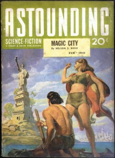 Não contei conversa, cliquei no Google e fui lá (http://storypilot.com/sf/art/asf/asf-194102.jpg). De fato, lá está a imagem de um casal em roupas de tarzan-e-jane, remando numa canoa, aproximando-se de uma praia na qual se ergue o familiar pedestal de pedra, sendo tomado pelo matagal, e a familiaríssima estátua, meio estragada mas reconhecível. A única diferença é que não está meio enterrada; mas trata-se, claramente, da única ruína sobrevivente de uma grande cidade.