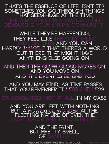 Welcome to Nigth Vale. Descobri numa das 1756 páginas de Tumblr que sigo e não consigo parar de ouvir...Nigth Vale é uma comunidade imaginada que fica no deserto, em parte incerta do território americano, e que tem um programa de rádio que dá conta do que se vai passando por lá - notícias, comunicados, meteorologia...No entanto, aqui acontecem coisas do além: dinossauros invadem reuniões, auras aparecem em torno dos objectos e crescem árvores dentro da biblioteca. Imagem uma versão ligeira do twilight zone...É bizarro e encantador ao mesmo tempo.