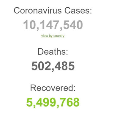 O estado do mundo, hoje. Mais de dez milhões de infectados, mais de meio milhão de mortos, mais de cinco milhões de recuperados.