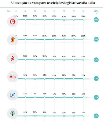 PITAGÓRICA Fonte: Da Literatura - Eduardo Pitta | Publicado em: 2019-10-01 00:00 política, pesquisa eleitoral, Portugal Pitagórica, ontem à noite, para a TVI, JN e TSF: PS = 37,4% / PSD = 28,5% / BE = 8,9% / CDU = 7,4% / CDS = 4,0% / PAN = 3,8% Clique na imagem do Jornal de Notícias. Texto originalmente publicado em Da Literatura - Eduardo Pitta Leia também PITAGÓRICA via Da Literatura - Eduardo Pitta PITAGÓRICA via Da Literatura - Eduardo Pitta PITAGÓRICA via Da Literatura - Eduardo Pitta PITAGÓRICA via Da Literatura - Eduardo Pitta PITAGÓRICA 2 via Da Literatura - Eduardo Pitta