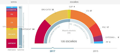 O partido mais votado foi, sem surpresa, o CIUDADANOS de Inés Arrimadas, com 37 deputados. Do outro lado, contra as sondagens, JUNTS PER CATALUNYA de Carles Puigdemont ficou em 2.º lugar (e não em terceiro), com 34. Em 3.º ficou a ERC de Oriol Junqueras, com 32. O PSC de Miquel Iceta elegeu 17. O partido de Rajoy & Albiol afundou-se, passando de 11 para 3 deputados. Nota curiosa: depois dos ziguezagues da campanha, CATALUNYA EN COMÚ-PODEM de Xavier Domènech colocou-se do lado constitucional. Tudo somado, o bloco independentista elegeu 70 deputados, e os constitucionalistas, apesar de terem obtido mais votos (52,1%), só elegeram 65.