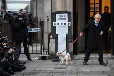 Na imagem, vemos Boris Johnson a sair a assembleia de voto do Methodist Central Hall, em Londres.